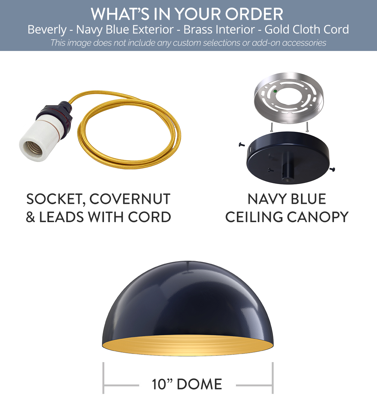 Beverly x (1) Color: Navy Blue Interior Color: Brass Mount: 4 ft Gold Cloth Cord