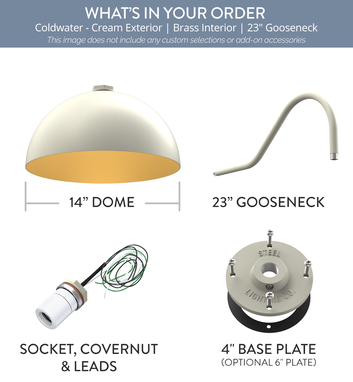 The Coldwater offers a modern twist on the classic light fixture, designed to bring timeless appeal to a variety of spaces. With its 14-inch dome, this modern bowl light creates a bold yet refined presence, making it the perfect accent for entryway lighting, or positioned above vanities or kitchen sinks. Its sleek design enhances any setting, providing both elegance and functional lighting. Handcrafted from 18-gauge American steel, the Coldwater’s powder-coated finish ensures superior rust protection, making it durable enough for both indoor and outdoor use. The fixture’s versatility and contemporary style allow it to fit seamlessly into modern homes while retaining the classic look of a traditional bowl light.