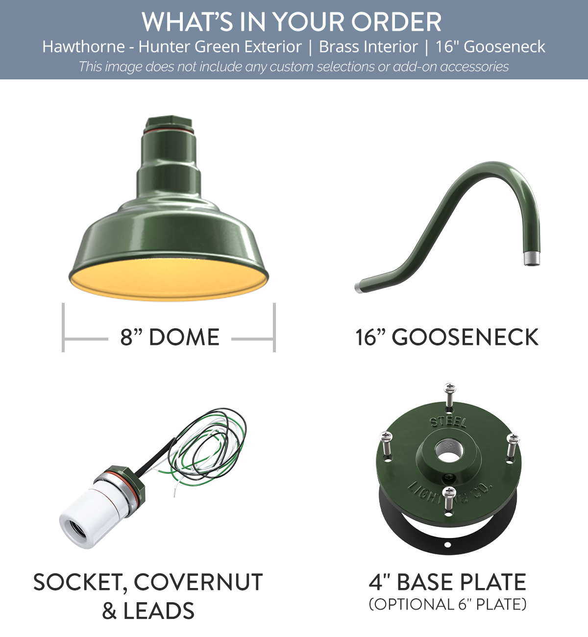 Hawthorne x (1) Color: Hunter Green Interior Color: Brass Mount: 16" Gooseneck