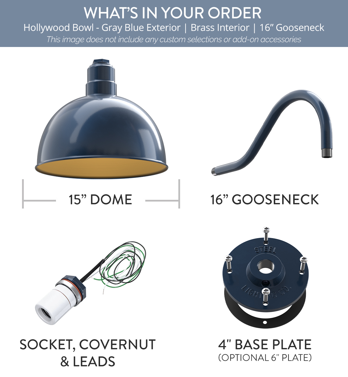 This stately bowl-shaped barn house light is a true entertainer of space, its large size can amp up the character and wow any crowd. The Hollywood Bowl is a sturdy fixture that comes standard with a 15” wide and 12″ tall dome. This bold favorite is here to make a big impact on your space while maintaining its barn house roots. Simply pick between 20” straight arm, 16” gooseneck, or 23” gooseneck, then order, install, and feel at home under Steel Lighting. When you’re crafting a space to bring your story to light, this large lighting fixture dome can stand out on its own, or quietly pull everything together in style. As with every light we craft, The Hollywood Bowl is handmade from heavy-duty steel, then powder coated for the high-quality, long-lasting finish we all know and love. Creating a space full of quality and character is easy with help from The Hollywood Bowl, which does best when used outdoors, and looks great on large exterior walls (like on a garage), on barn sides, or perched high among the roof peaks and tall eves of your estate. Want to install it indoors? Be our guest! Our lights are all approved for indoor and outdoor use.