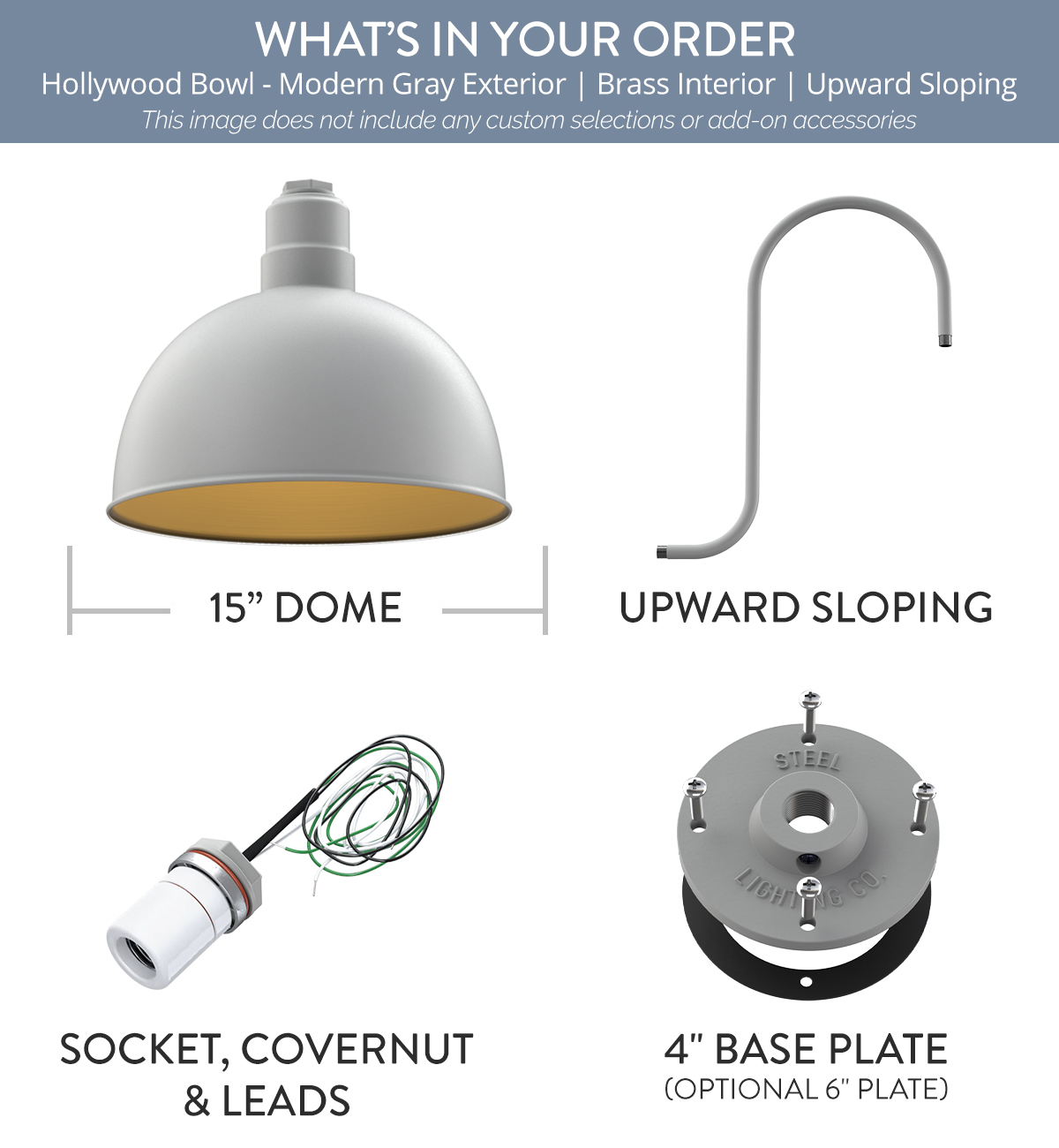 This stately bowl-shaped barn house light is a true entertainer of space, its large size can amp up the character and wow any crowd. The Hollywood Bowl is a sturdy fixture that comes standard with a 15” wide and 12″ tall dome. This bold favorite is here to make a big impact on your space while maintaining its barn house roots. Simply pick between 20” straight arm, 16” gooseneck, or 23” gooseneck, then order, install, and feel at home under Steel Lighting. When you’re crafting a space to bring your story to light, this large lighting fixture dome can stand out on its own, or quietly pull everything together in style. As with every light we craft, The Hollywood Bowl is handmade from heavy-duty steel, then powder coated for the high-quality, long-lasting finish we all know and love. Creating a space full of quality and character is easy with help from The Hollywood Bowl, which does best when used outdoors, and looks great on large exterior walls (like on a garage), on barn sides, or perched high among the roof peaks and tall eves of your estate. Want to install it indoors? Be our guest! Our lights are all approved for indoor and outdoor use.