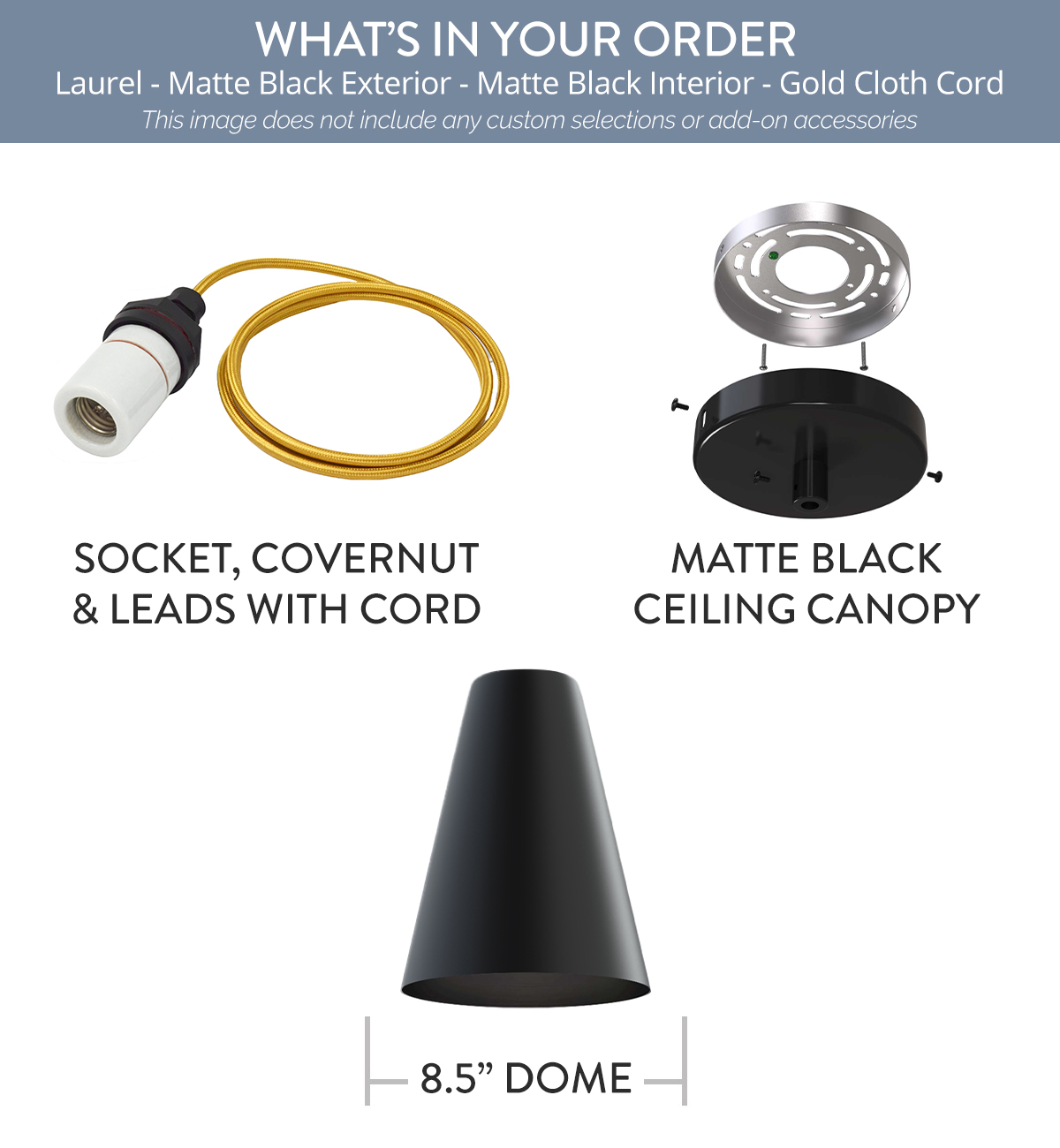 Laurel Color Matte Black Interior Color Matte Black with a 4 ft Gold Cloth Cord