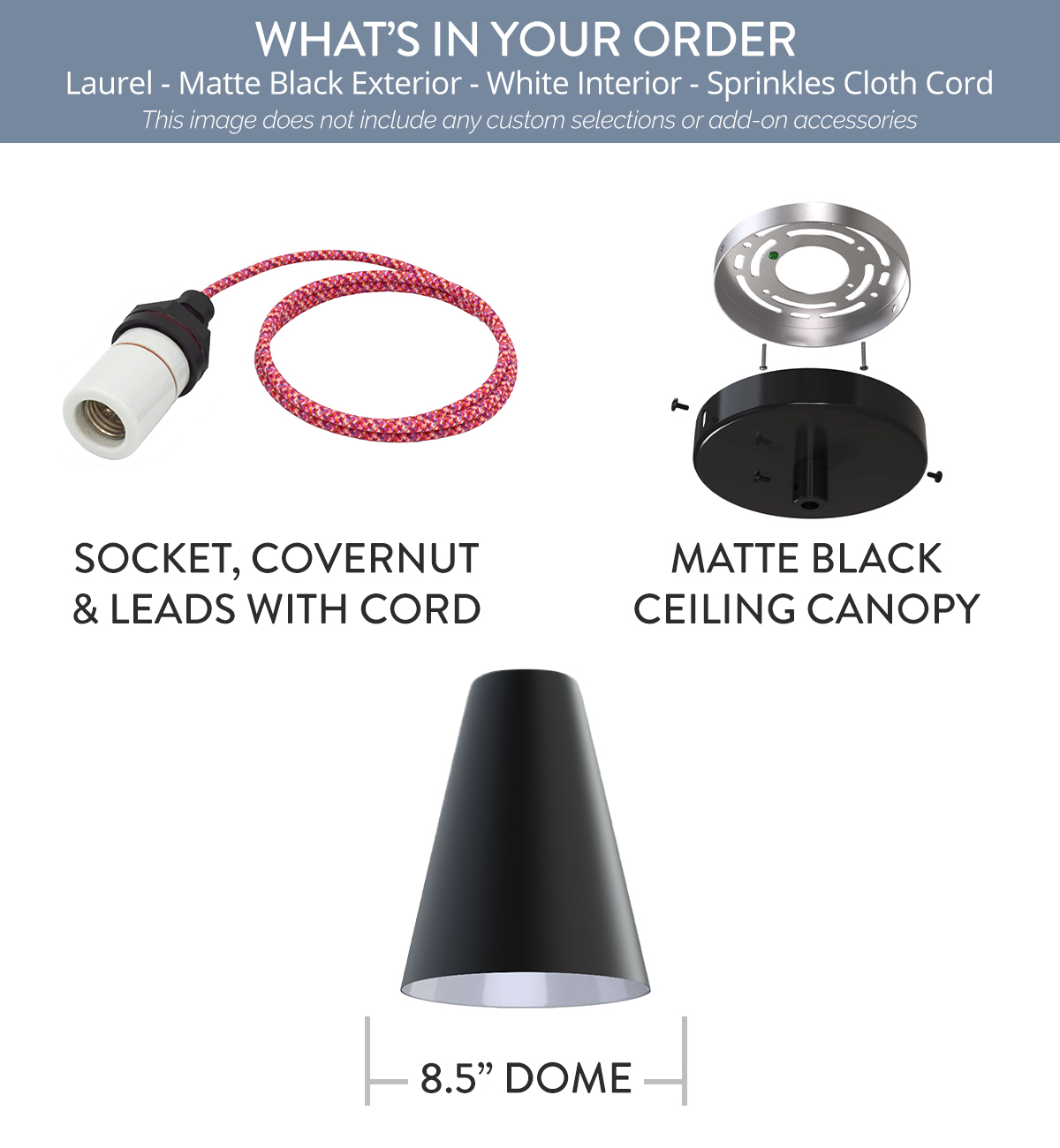 Laurel x (1) Color: Matte Black Interior Color: White Mount: 4 ft Sprinkles Cloth Cord