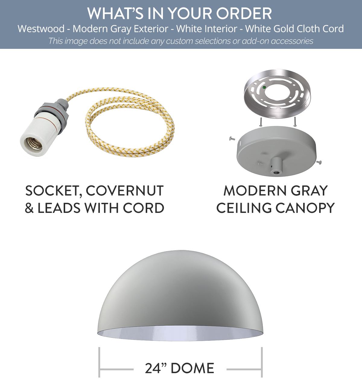 The Westwood pendant sports a modern industrial design that will showcase your home with a bold touch. With a 24" diameter, the Westwood works great by itself, or in pairs for the kitchen island, table, or living room lighting. It's crafted from 18-gauge steel and powder coated for an added industrial touch with additional protection and longevity. Wherever you choose to install this light, it'll leave a lasting impression for years to come! It comes standard with an E26 Medium base socket that’ll accept multiple styles of bulbs so you can create the right atmosphere wherever you decide to install it. If you need a smaller dome size, check out our other variations of this dome; The Melrose (18") or the Brentwood (14"). The Westwood can be installed on a sloped ceiling. The cord will automatically adjust and hang straight down from the mounting place. Crafted with the kitchen island in mind, this light comes with a matte black, or white exterior with your choice of white, matte black, or brass for the interior color. Due to its large size, it's a perfect fit for kitchen lighting, dining room lighting and anywhere in between that requires ample light spread.