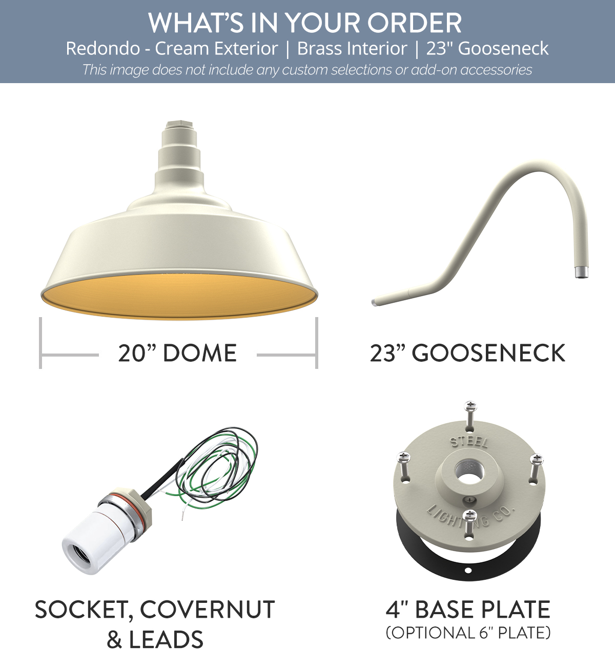 Our largest industrial barn house lighting fixture has a big presence and can make an even bigger statement when added to your story. This sizable favorite really shines in providing ample light when installed at least 15 feet off the ground. The Redondo is a large barn light with sturdy construction that comes standard with a 20″ dome and connects to your choice of a 20″ straight arm, a 16″ gooseneck, a 23″ gooseneck, or an upward-sloping gooseneck. Simply choose your arm length and style, then order, install, and feel at home under Steel Lighting Co. When you’re crafting a space to bring your story to light, this large barn light fixture can stand out on its own, or confidently pull everything together in style. As with every light we craft, The Redondo is handmade from heavy duty steel, then powder coated for the high quality, long lasting finish we all know and love. Creating a space full of quality and character is easy with help from The Redondo, which does best when used outdoors, and looks great on large exterior walls (like on a garage or oversized building), on barn sides, or perched high among the roof peaks and tall eves of your estate. Want to install it indoors? Be our very bold guest! Our lights are all approved for indoor and outdoor use, no matter how big or how small.