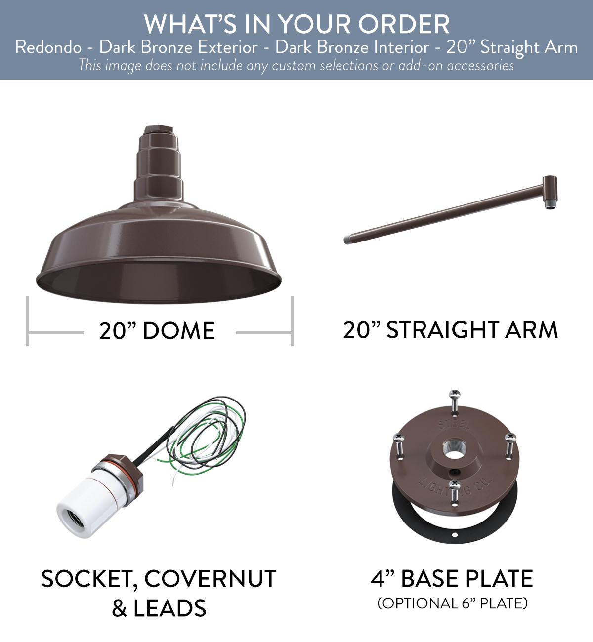 Our largest industrial barn house lighting fixture has a big presence and can make an even bigger statement when added to your story. This sizable favorite really shines in providing ample light when installed at least 15 feet off the ground. The Redondo is a large barn light with sturdy construction that comes standard with a 20″ dome and connects to your choice of a 20″ straight arm, a 16″ gooseneck, a 23″ gooseneck, or an upward-sloping gooseneck. Simply choose your arm length and style, then order, install, and feel at home under Steel Lighting Co. When you’re crafting a space to bring your story to light, this large barn light fixture can stand out on its own, or confidently pull everything together in style. As with every light we craft, The Redondo is handmade from heavy duty steel, then powder coated for the high quality, long lasting finish we all know and love. Creating a space full of quality and character is easy with help from The Redondo, which does best when used outdoors, and looks great on large exterior walls (like on a garage or oversized building), on barn sides, or perched high among the roof peaks and tall eves of your estate. Want to install it indoors? Be our very bold guest! Our lights are all approved for indoor and outdoor use, no matter how big or how small.