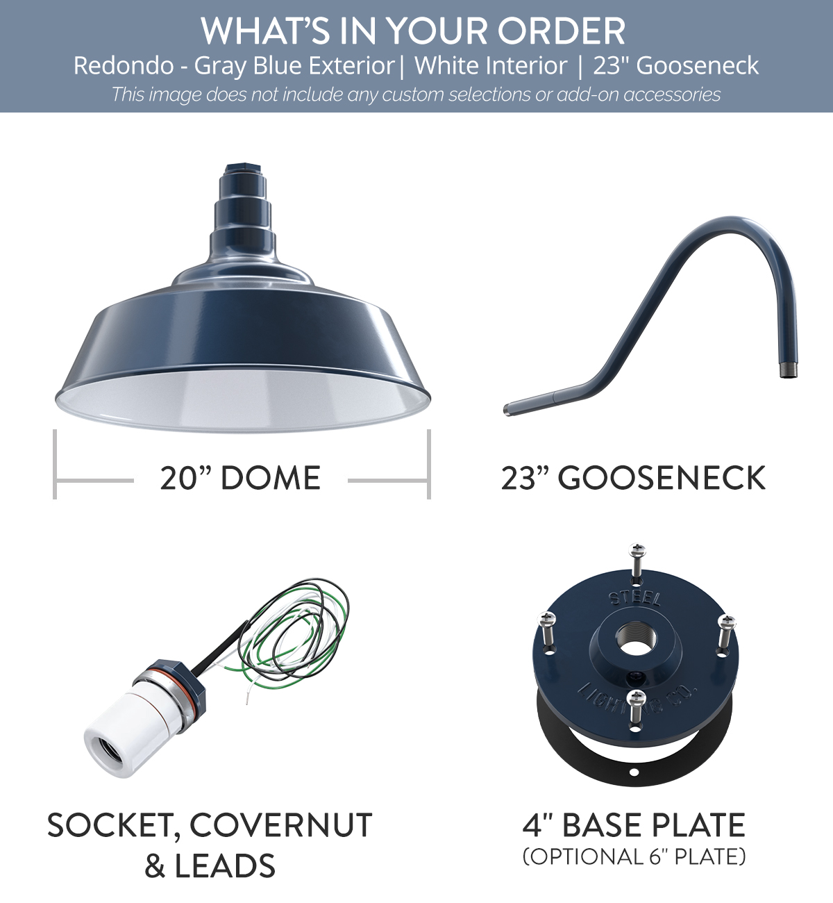 Our largest industrial barn house lighting fixture has a big presence and can make an even bigger statement when added to your story. This sizable favorite really shines in providing ample light when installed at least 15 feet off the ground. The Redondo is a large barn light with sturdy construction that comes standard with a 20″ dome and connects to your choice of a 20″ straight arm, a 16″ gooseneck, a 23″ gooseneck, or an upward-sloping gooseneck. Simply choose your arm length and style, then order, install, and feel at home under Steel Lighting Co. When you’re crafting a space to bring your story to light, this large barn light fixture can stand out on its own, or confidently pull everything together in style. As with every light we craft, The Redondo is handmade from heavy duty steel, then powder coated for the high quality, long lasting finish we all know and love. Creating a space full of quality and character is easy with help from The Redondo, which does best when used outdoors, and looks great on large exterior walls (like on a garage or oversized building), on barn sides, or perched high among the roof peaks and tall eves of your estate. Want to install it indoors? Be our very bold guest! Our lights are all approved for indoor and outdoor use, no matter how big or how small.