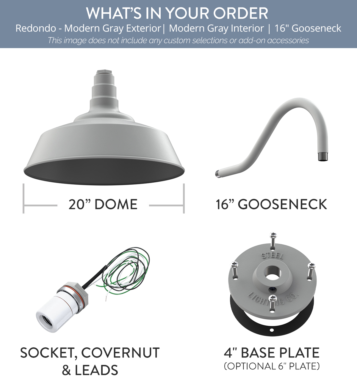 Our largest industrial barn house lighting fixture has a big presence and can make an even bigger statement when added to your story. This sizable favorite really shines in providing ample light when installed at least 15 feet off the ground. The Redondo is a large barn light with sturdy construction that comes standard with a 20″ dome and connects to your choice of a 20″ straight arm, a 16″ gooseneck, a 23″ gooseneck, or an upward-sloping gooseneck. Simply choose your arm length and style, then order, install, and feel at home under Steel Lighting Co. When you’re crafting a space to bring your story to light, this large barn light fixture can stand out on its own, or confidently pull everything together in style. As with every light we craft, The Redondo is handmade from heavy duty steel, then powder coated for the high quality, long lasting finish we all know and love. Creating a space full of quality and character is easy with help from The Redondo, which does best when used outdoors, and looks great on large exterior walls (like on a garage or oversized building), on barn sides, or perched high among the roof peaks and tall eves of your estate. Want to install it indoors? Be our very bold guest! Our lights are all approved for indoor and outdoor use, no matter how big or how small.