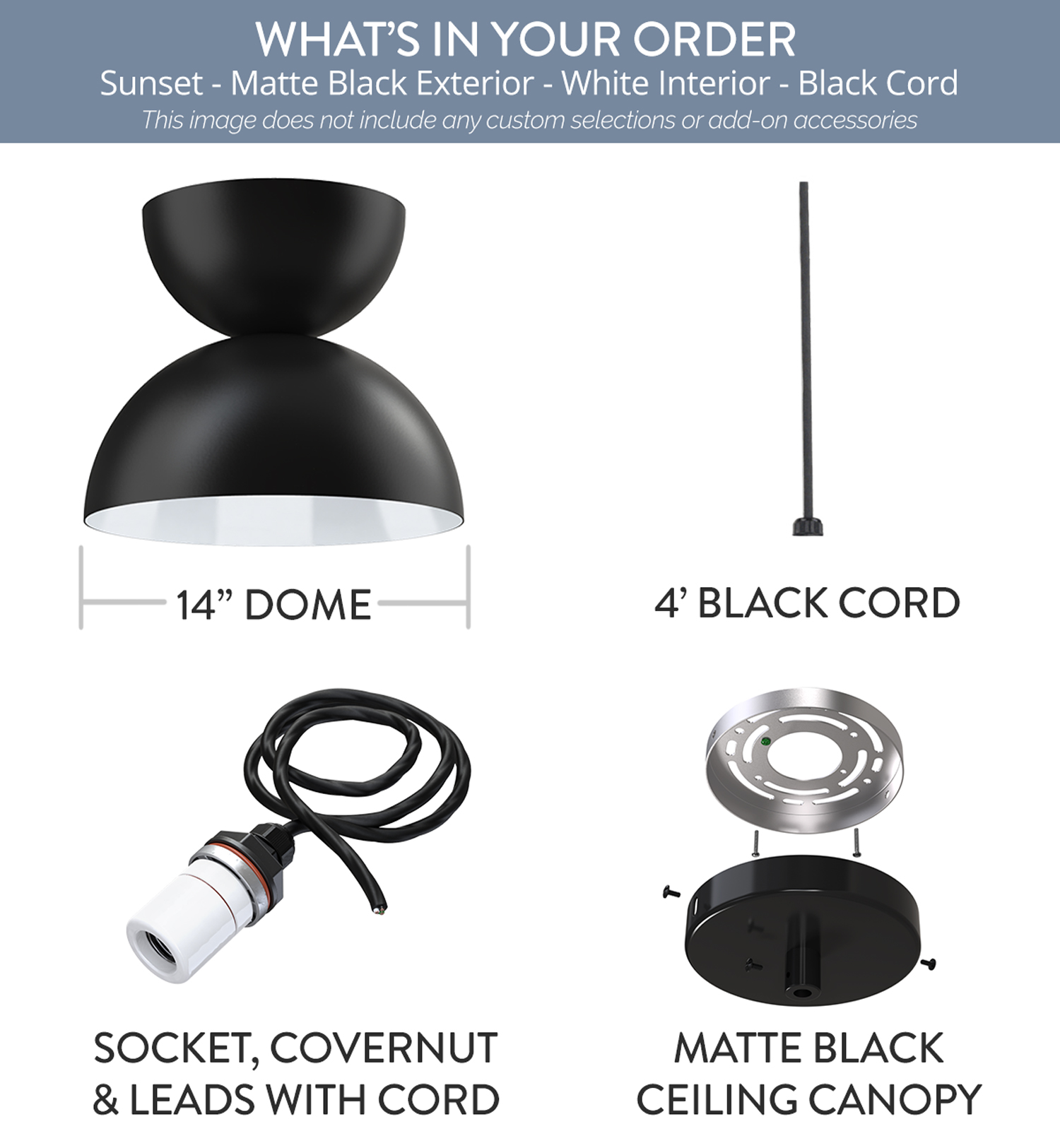 The Sunset pendant stands apart with its stackedโbowl silhouette, offering a fresh interpretation of classic bowl lighting. Handโcrafted from 18โgauge American steel and powderโcoated for longโterm durability, it fits naturally into contemporary lofts, farmhouse kitchens, and commercial dining rooms that need a focal point with a modern design. Light is directed through the lower bowl, providing clear, focused illumination for worktops or seating areas, while the upper bowl delivers visual balance without glare. Choose from our full palette of powder coated colors and cord styles to tailor the Sunset to your design vision. Each fixture features a Porcelain #30 Medium Base Socket compatible with any E26 bulb, including energyโsaving LEDs. Pair it with a dimmable bulb and switch to set the ideal mood for meals, gatherings, or quiet evenings. Explore more of our modern pendant lights or combine the Sunset with other handcrafted lights to complete a cohesive lighting plan across your project.