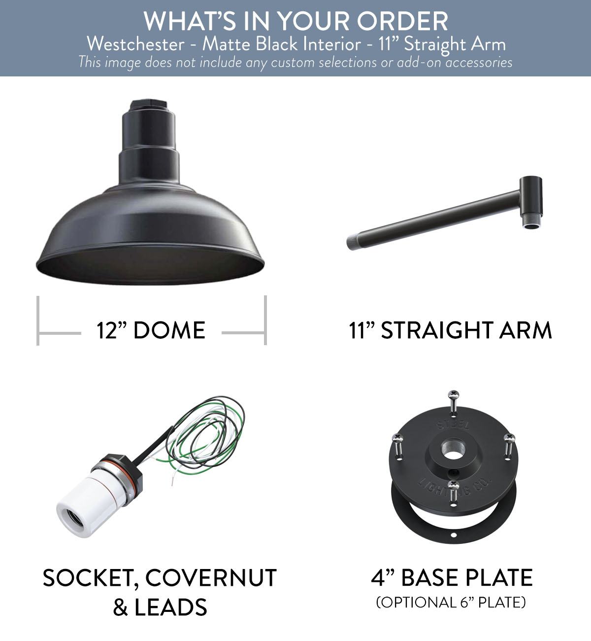 This medium-sized industrial wall light is comparable to the size of a large mixing bowl and serves up ample character to match. This light is our most flexible size as it can work in smaller or larger spaces and is not too overwhelming to use indoors! The Westchester is a sturdy fixture that comes standard with a 12” dome and it can be used in a million different ways wherever you see fit. Simply pick between 11” straight arm, 11" gooseneck, 16” gooseneck, or 23” gooseneck, then order, install, and feel at home under Steel Lighting.