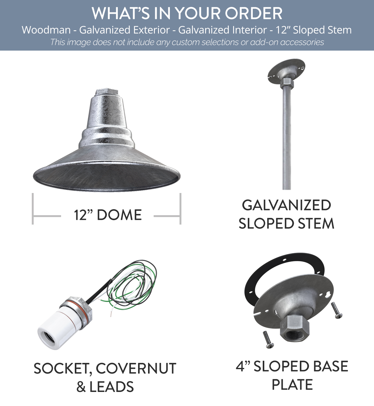 Woodman x (1) Color: Galvanized Interior Color: Galvanized Mount: 12" Sloped Stem