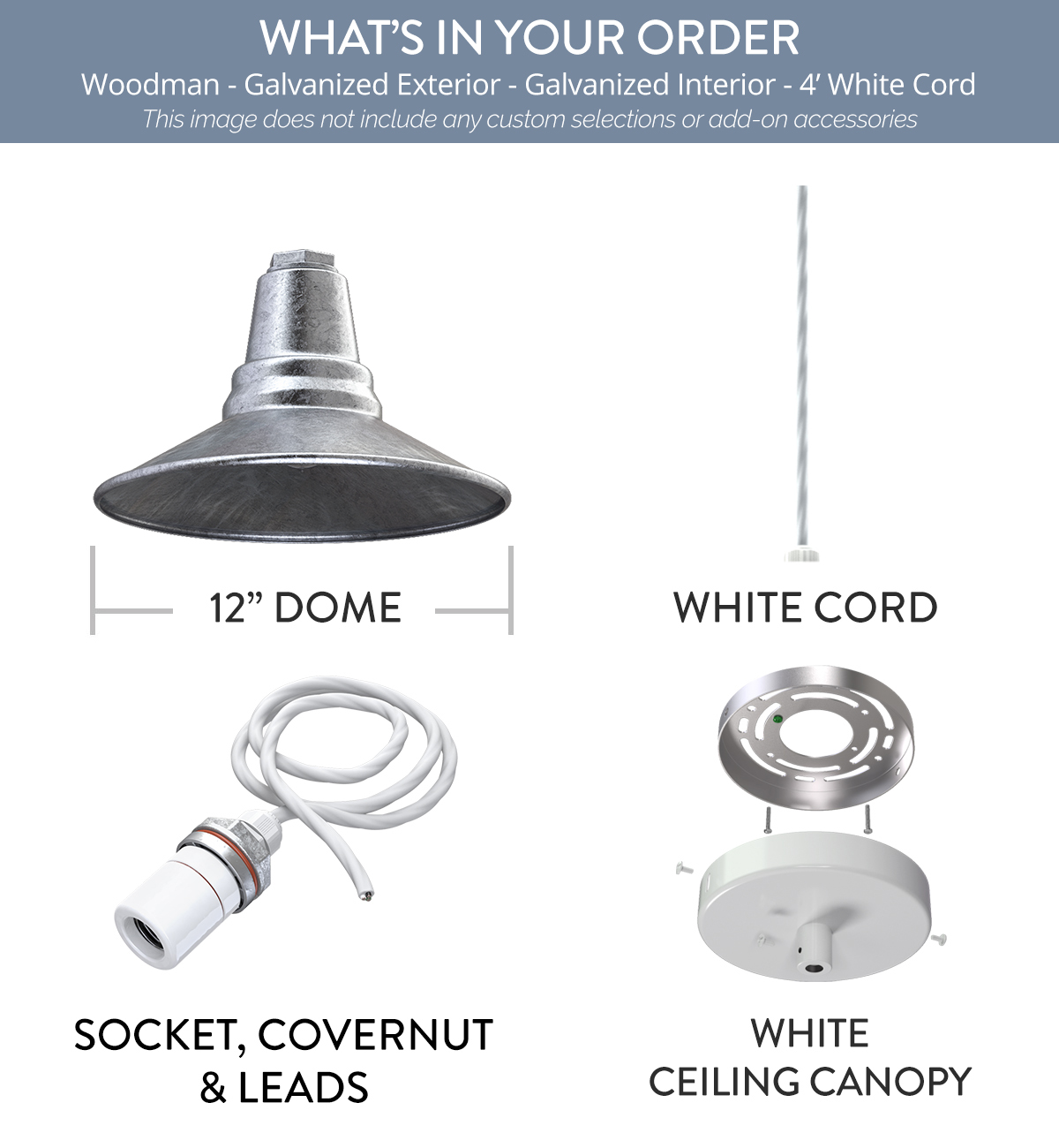 Woodman x (1) Color: Galvanized Interior Color: Galvanized Mount: 4 ft White Cord