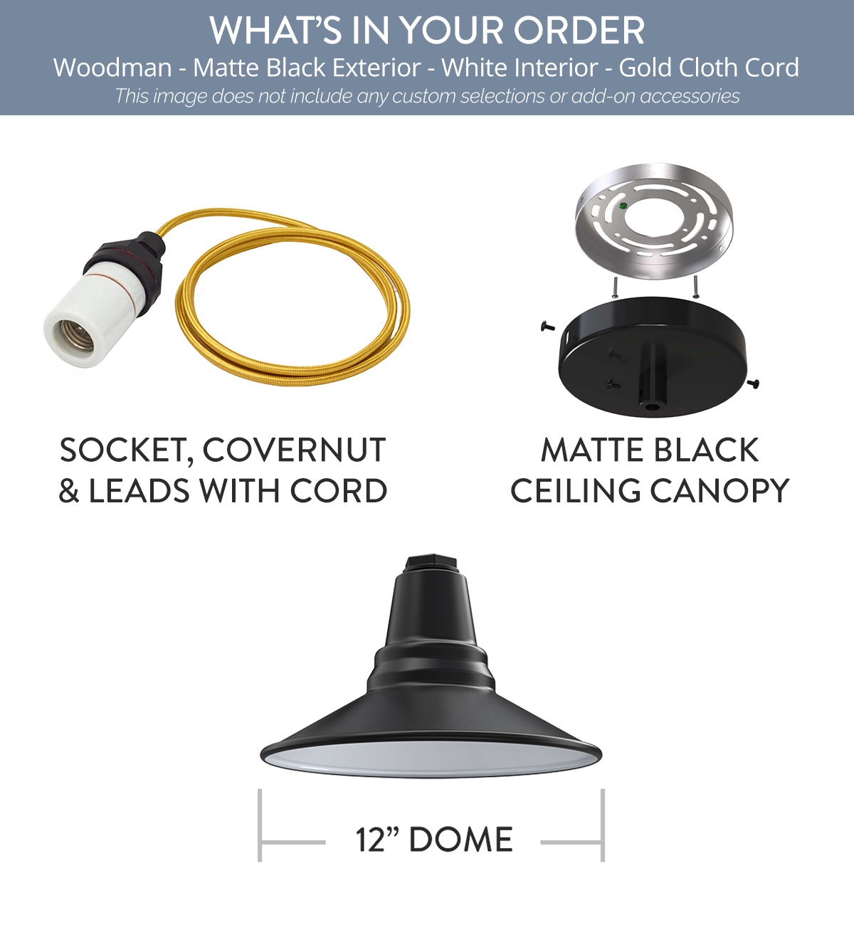 Woodman x (1) Color: Matte Black Interior Color: White Mount: 4 ft Gold Cloth Cord