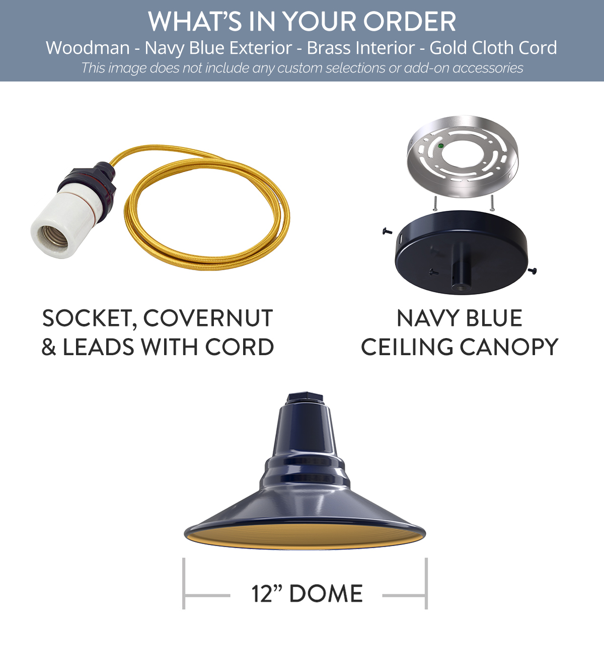 Woodman x (1) Color: Navy Blue Interior Color: Brass Mount: 4 ft Gold Cloth Cord