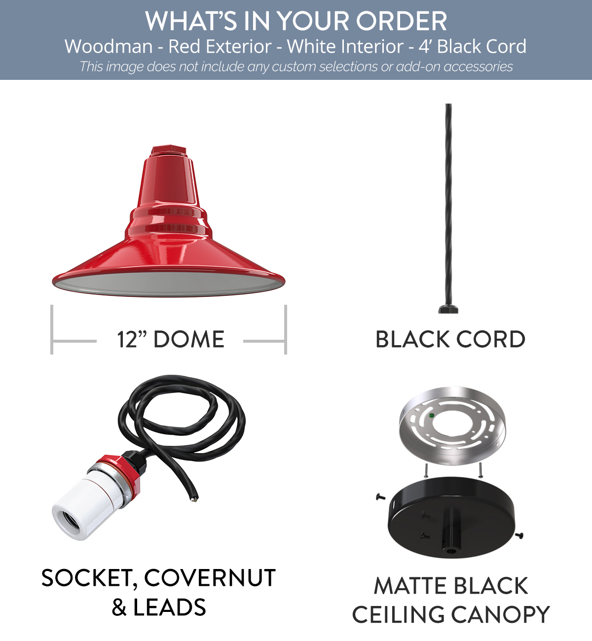 Woodman x (1) Color: Red Interior Color: White Mount: 4 ft Black Cord