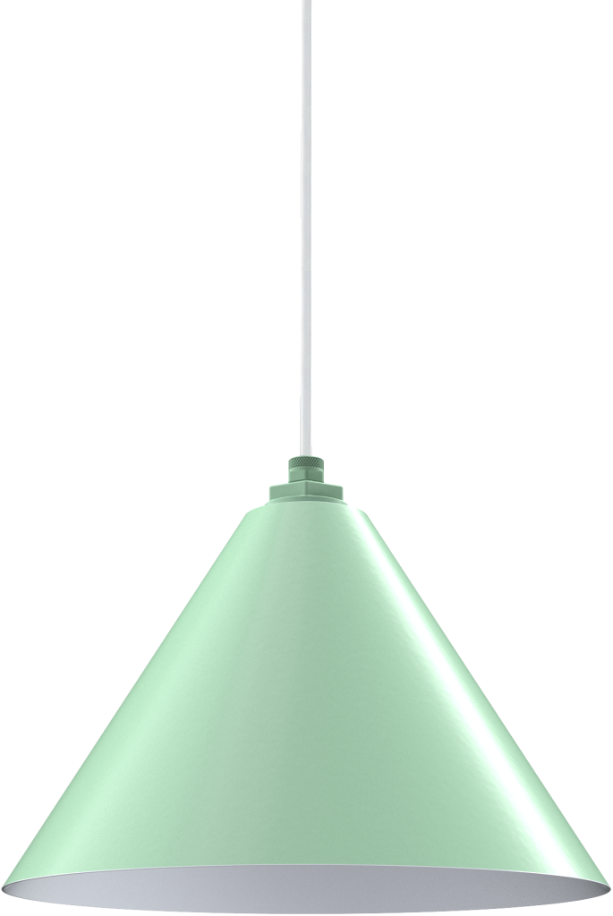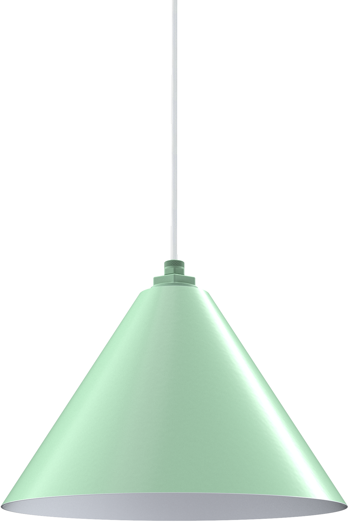 Modern green pendant light with a sleek design and warm interior glow hanging from a cord.