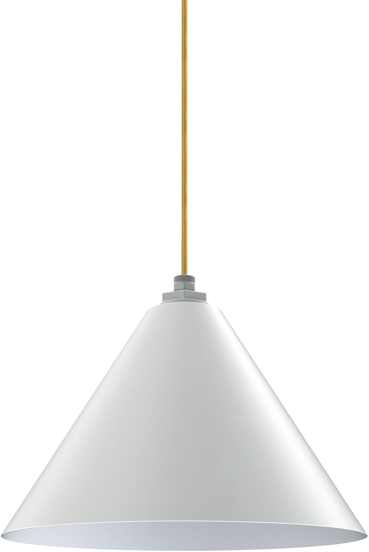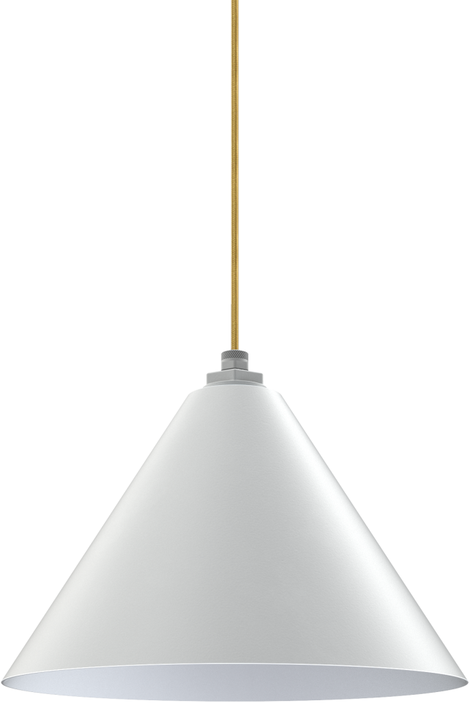 Modern white metal pendant light with gold cord, ideal for kitchen or dining room décor.